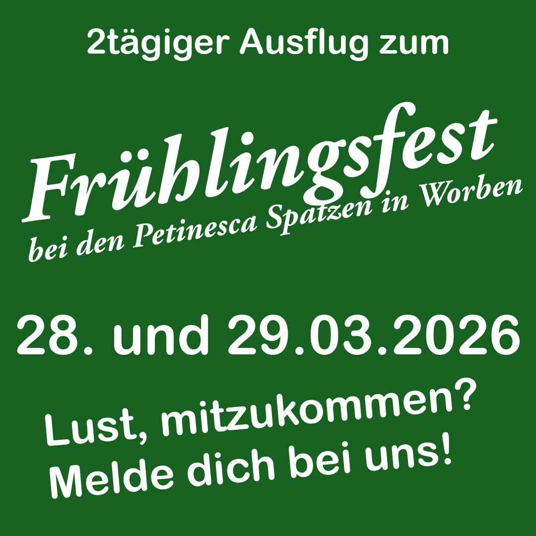 Am 28. und 29. März 2026 fahren wir zum Konzert zu den Petinesca Spatzen nach Worben. Dies verbinden wir mit einem zweitägigen Ausflug. Im Car hat es noch Platz. Chunsch mit? Dann melde dich bei uns!