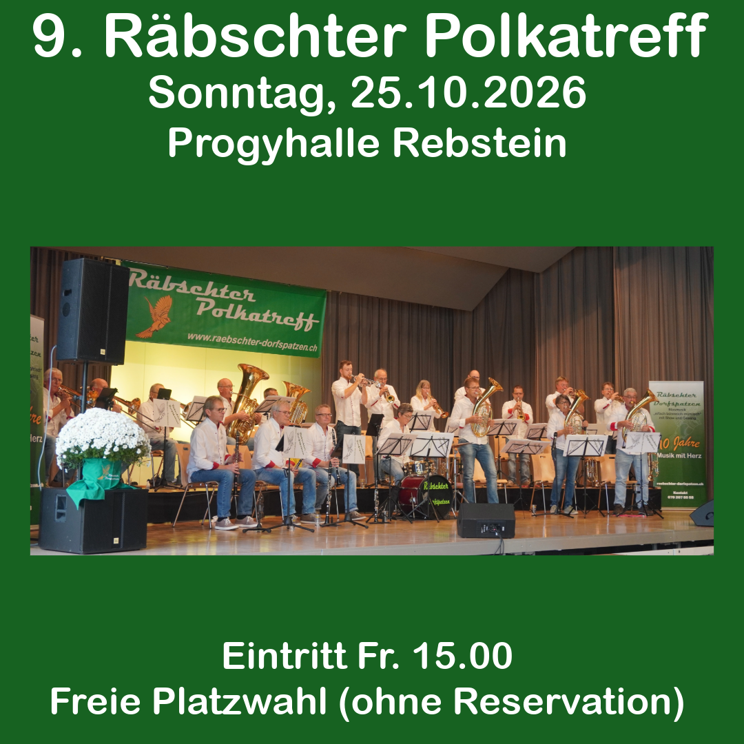 Am 25. Oktober 2026 führen wir den neunten Räbschter Polkatreff durch. Wiederum sind zwei Blaskapellen bei uns zu Gast.